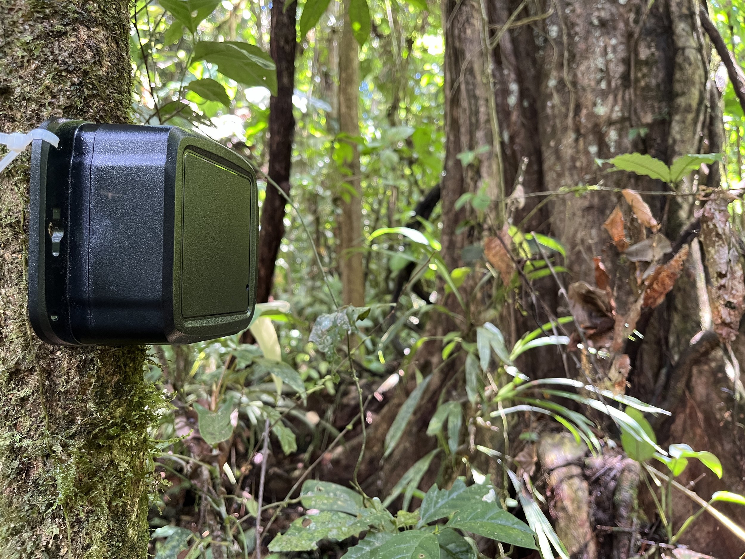 Photo: (Eliot Miller, 2024) An autonomous recording unit, an audio recording device, deployed by the BirdsPlus team in Costa Rica for bioacoustics monitoring.